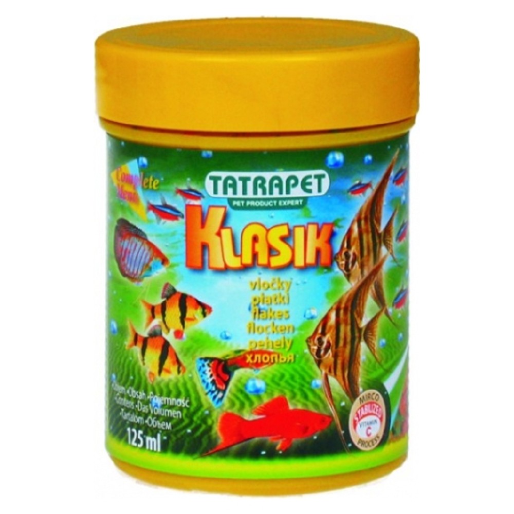 Kompletní vločkové krmivo pro okrasné ryby.