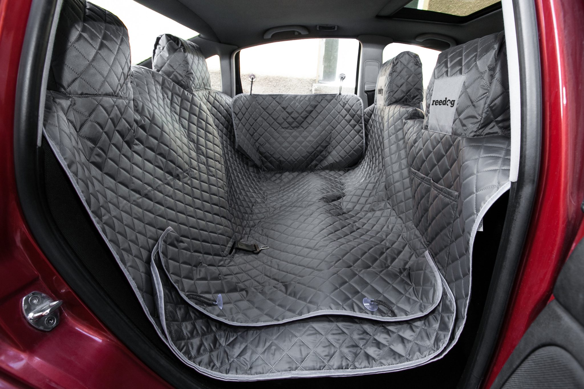 Nemusíte se bát, že by vám potah klouzal po autě, stačí ho přísavkami připnout na okno a váš nový Reedog potah do auta bude držet na místě.