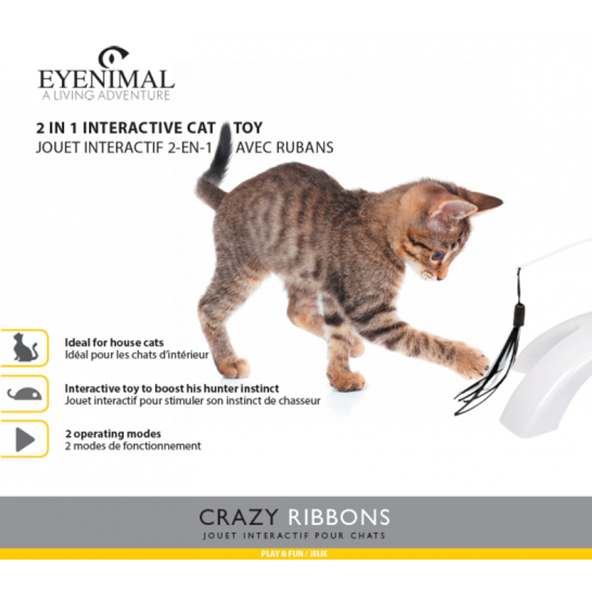 Hračka pro kočky Crazy Ribbons zabaví kočky všech věkových skupin, aby byly aktivní a motivované ke hře. Nepředvídatelný pohyb stuhy, která se točí dokola a mění směr stimuluje přirozený instinkt vaší kočky lovit, pronásledovat a vrhat se na kořist.