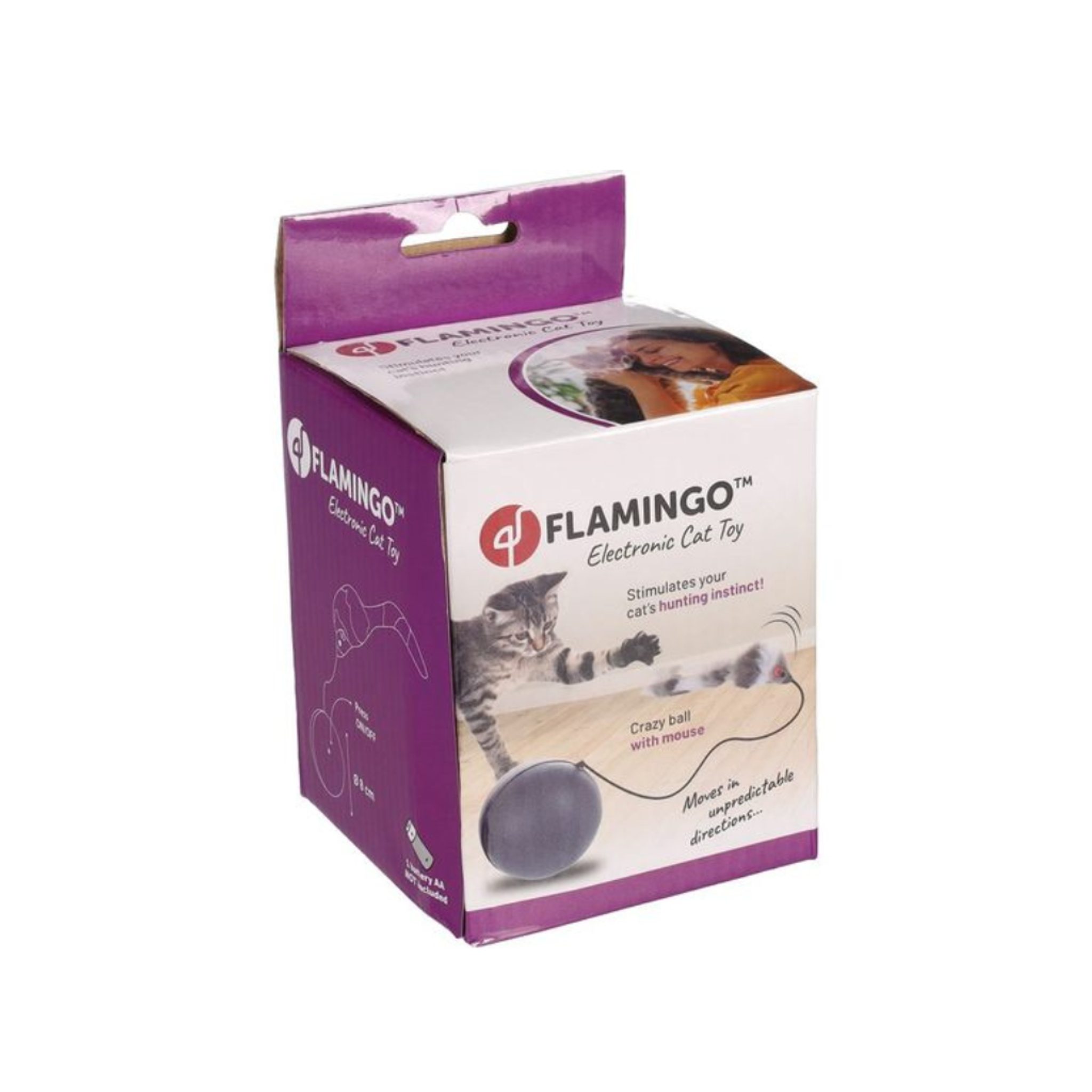 Interaktivní kočičí hračka od Flaminga je hračkou, kterou bude vaše kočka milovat! Rotující míček s myší visící na provázku vydává cvakání, aby stimuloval vaši kočku. Míček dělá nepředvídatelné pohyby, díky čemuž se nikdy nikde nezasekne. Tato mimořádná hračka byla navržena tak, aby probudila přirozený instinkt vaší kočky k lovu. Funguje na jednu 1x AA baterii (není součástí balení)