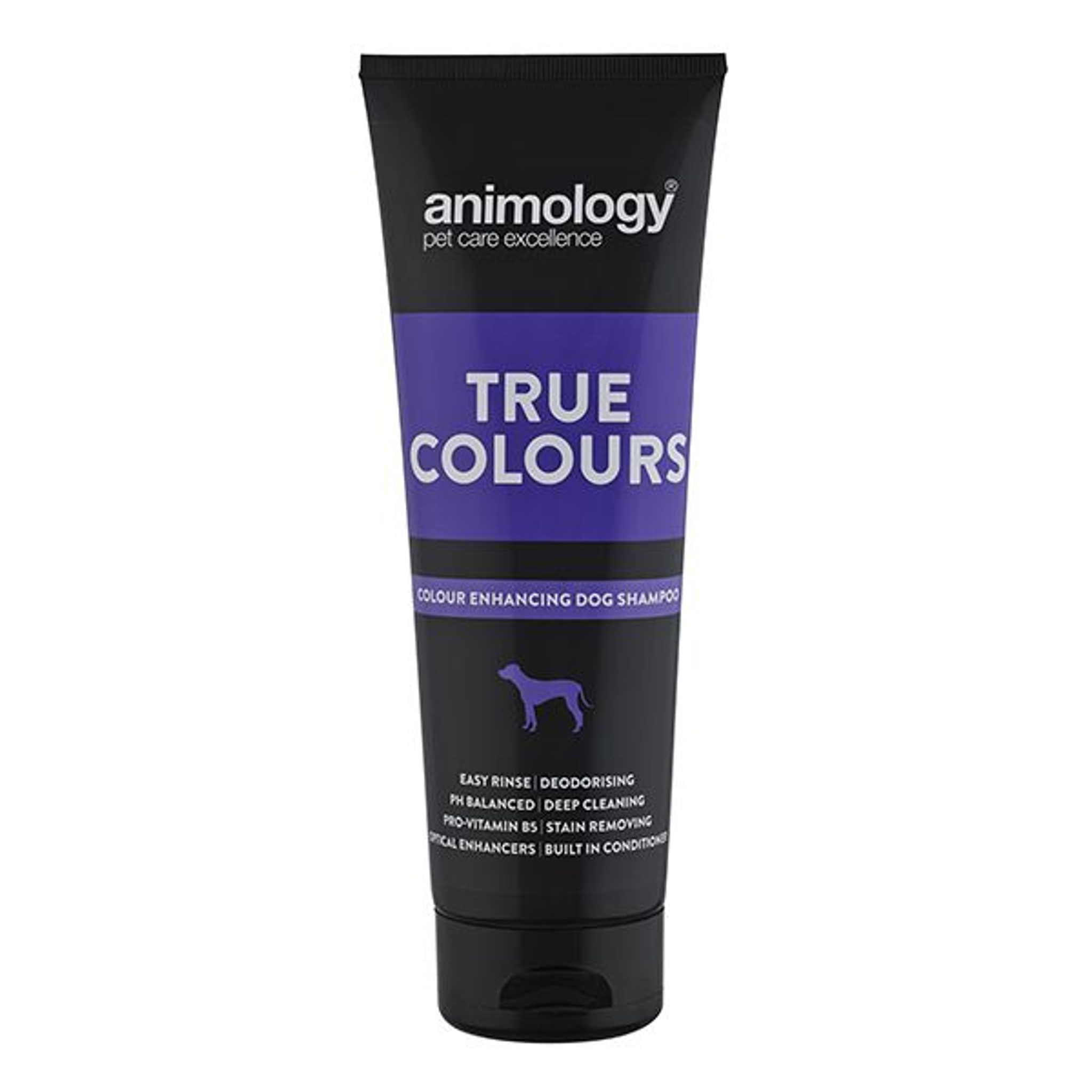 Speciálně navržený šampon Animology True Colours, zvýrazňuje celé spektrum barev u každého typu srsti psa. Srst vyčistí důkladně do hloubky a zanechá ji krásně zářivou, zároveň neutralizuje pachové bakterie. Důležitou vlastností šamponu je pH vhodné pro kůži psa s obsahem kondicionéru a důležitého pro-vitaminu B5.