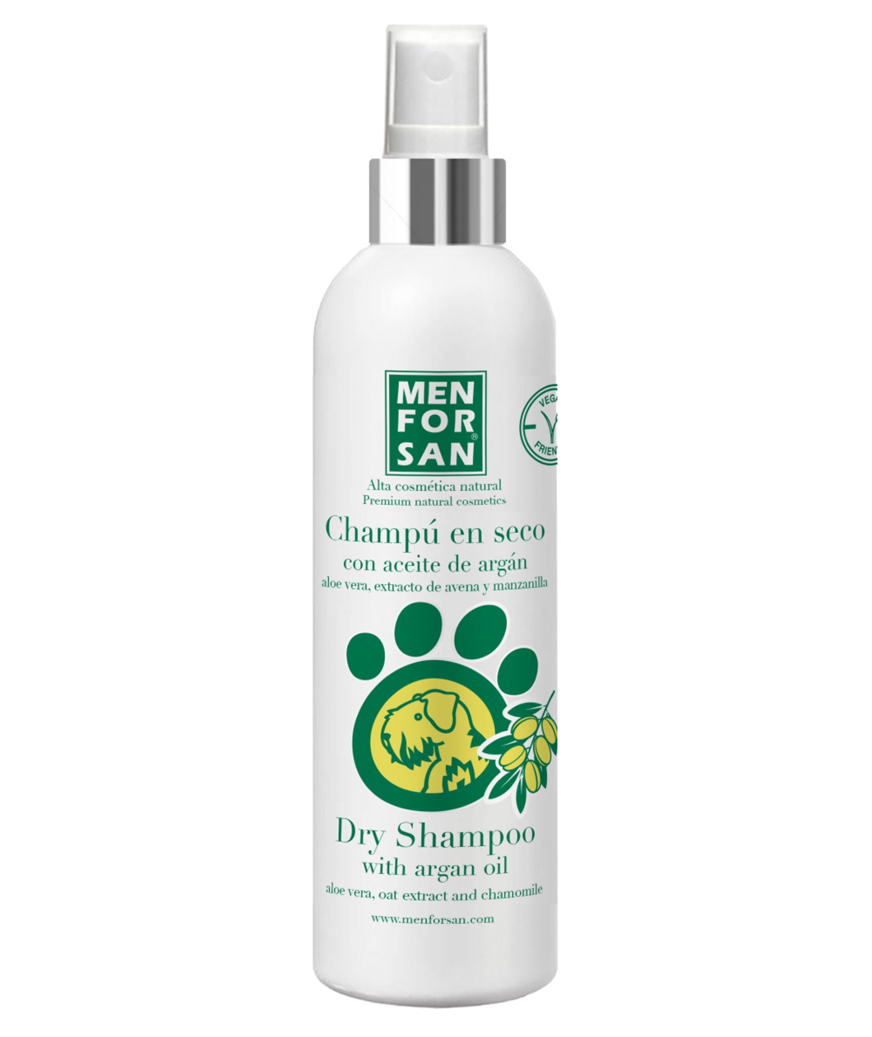 Suchý šampon pro psy na bázi arganového oleje, ovsa, heřmánku a aloe vera. Arganový olej má vyživující vlastnosti pro pokožku, aloe vera hydratuje a působí na citlivou pokožku a oves dodává srsti lesk, pružnost a hebkost. Objem: 250 ml.