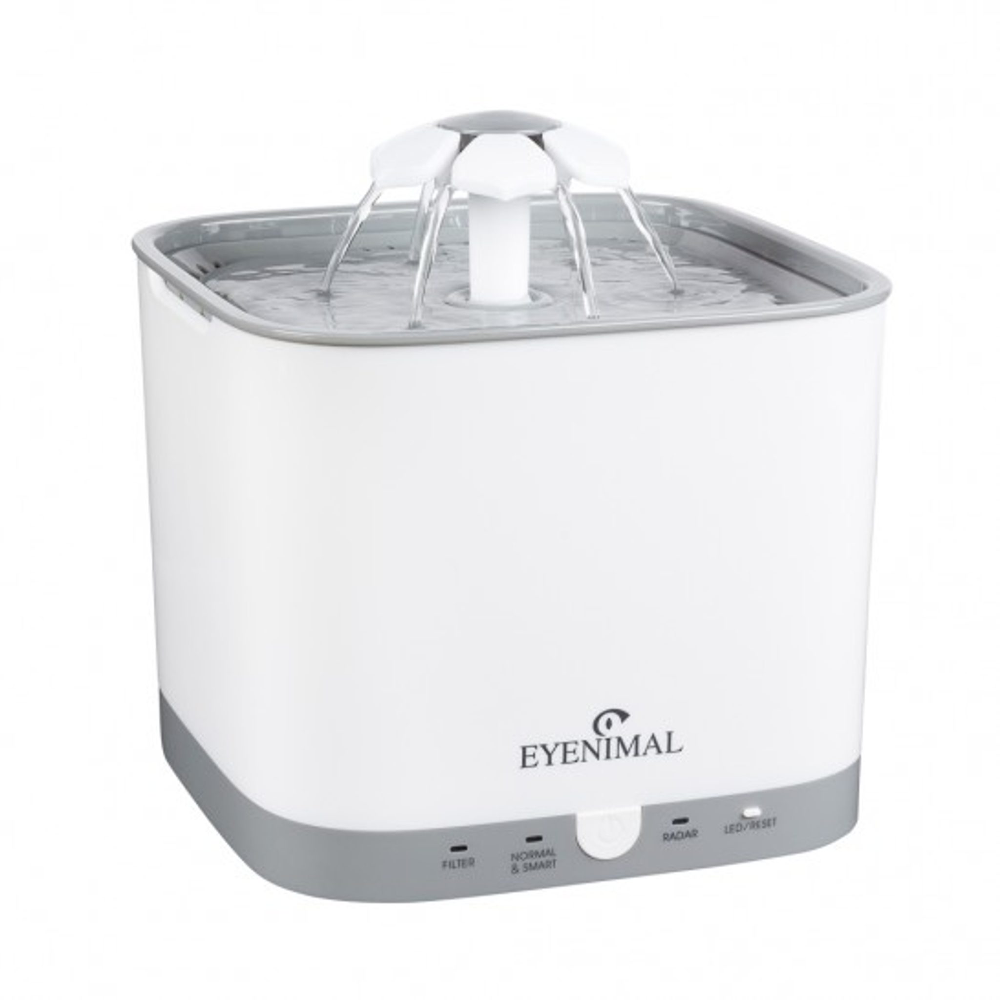 Eyenimal Smart Bloom Pet je moderní, tichá fontána vyrobena z kvalitních plastů, která je vhodná díky své velikosti pro kočky a malé psy. Kapacita 2 litrů pomáhá dodržovat pitný režim všech domácích mazlíčků a nabídne jim vždy čerstvou a čistou vodu. Dva různé nástavce a padající voda zajistí, aby byl pitný režim pro vaše chlupáče zábavným zážitkem. Nástavec ve tvaru květiny zajistí díky malým tryskám vizuální zážitek a rozptýlení vody kolem dokola. Druhý nástavec vytváří bublající pramen, který zaručeně přitáhne pozornost vašich čtyřnohých kamarádů. Fontána Eyenimal je vybavena spínacím čidlem pohybu, kdy se fontána uvede do provozu jen v okamžiku, kdy se kočka pohybuje poblíž. Fontánu je možné použít ve 3 pracovních režimech: normální, intervalový a pohybový. Trojitý filtr aktivního uhlíku čistí vodu ve fontáně hned třemi způsoby – odstraňuje chlupy a nečistoty, filtr s aktivním uhlím odstraní zápach vody a ionizace si poradí s těžkými kovy. Chytrá LED světla Vás upozorní na výměnu filtru, druh režimu a nízký stav vody.