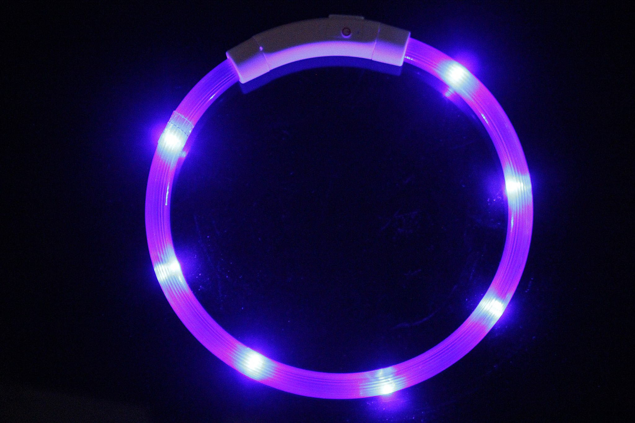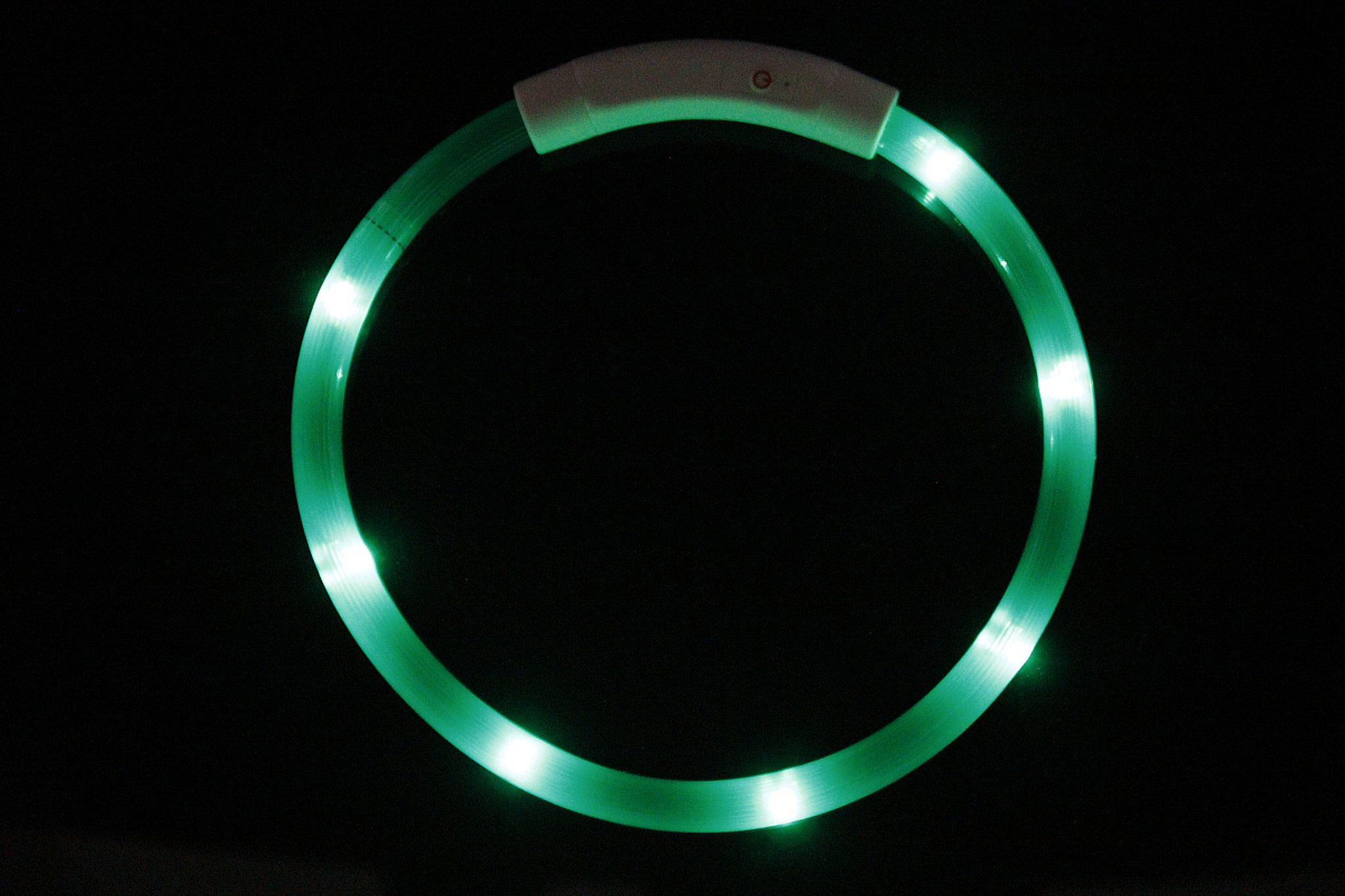 Svítící obojek je dobíjecí pomocí USB kabelu ( kabel je součástí balení ). Doba nabíjení činí 3-5 hodin a výdrž je 90 minut.