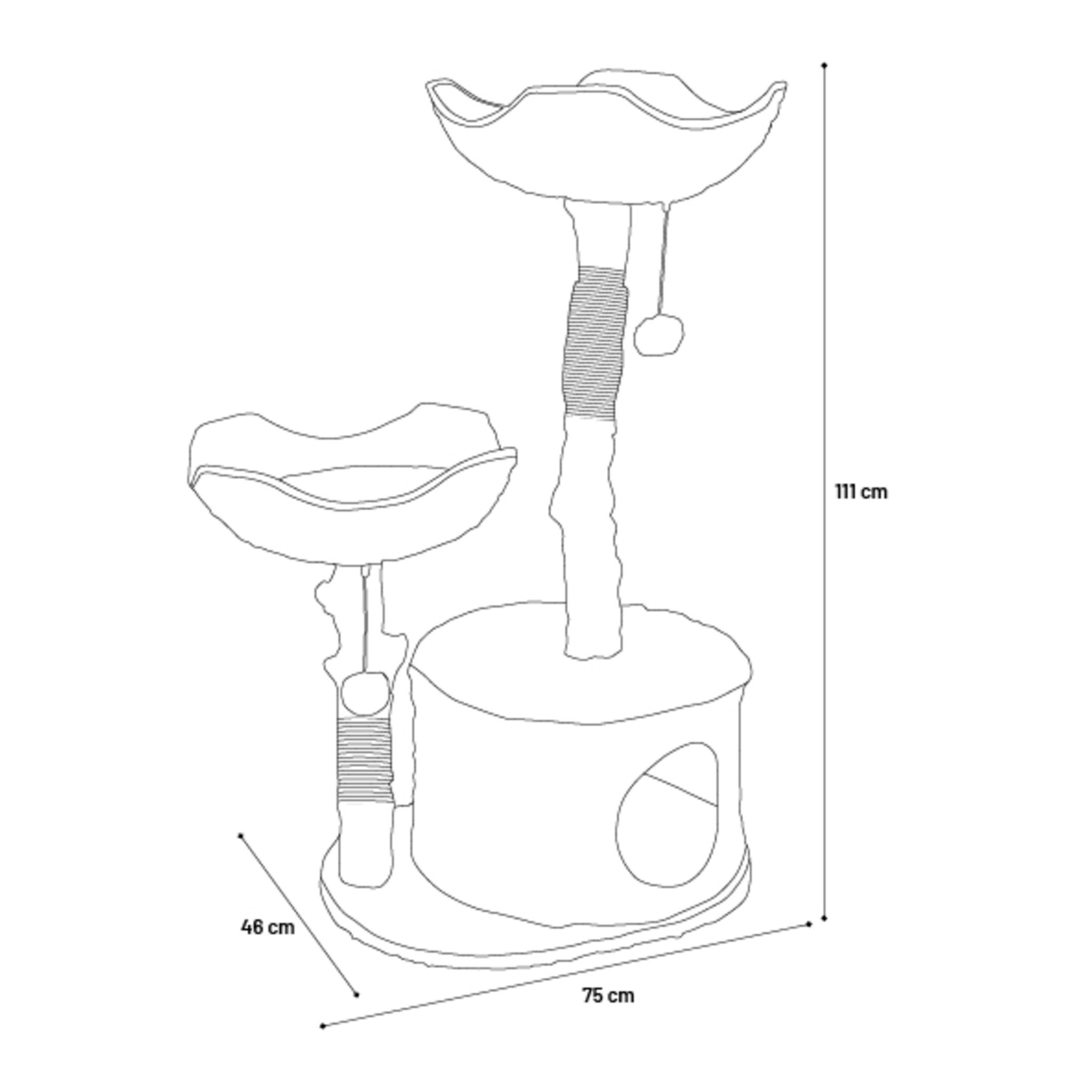 Sloupek s jutovým lanem (5 mm) uspokojí přirozenou potřebu škrábání. Plošiny s odnímatelnými polstrovanými polštářky a polstrovaný úkryt s textilním vnitřkem nabízejí komfortní místo k odpočinku. Odnímatelné polštářky lze čistit vlhkým hadříkem a jsou plněné polyesterovým vláknem.