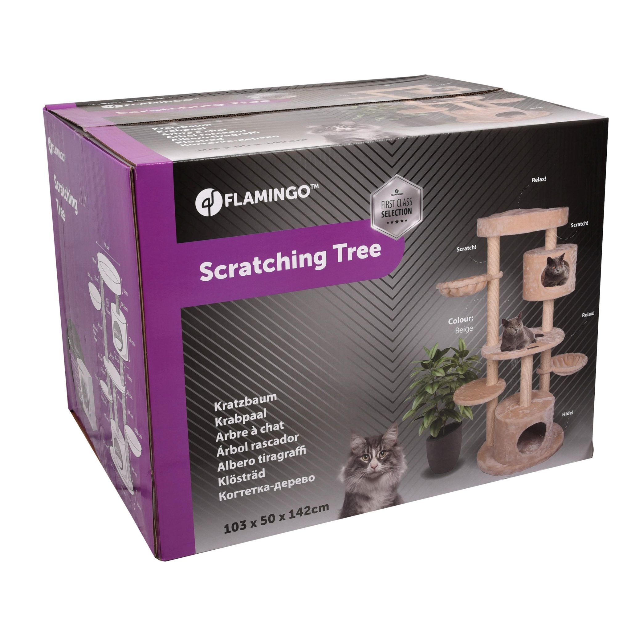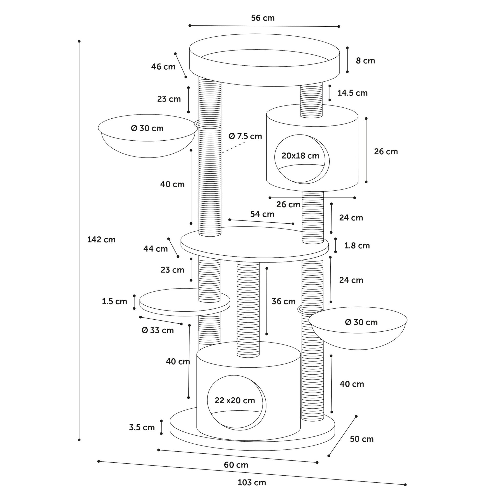 Darujte své kočce palác, který si zaslouží! Toto velké škrabadlo je pokryto měkkým plyšem, má sisalové škrabací sloupky (7,5 cm) a dvě pohodlné houpací sítě a úkryty pro klidný odpočinek. Pevná základna (60 x 50 cm) zajišťuje stabilitu a jemné barvy se hodí do každého interiéru.