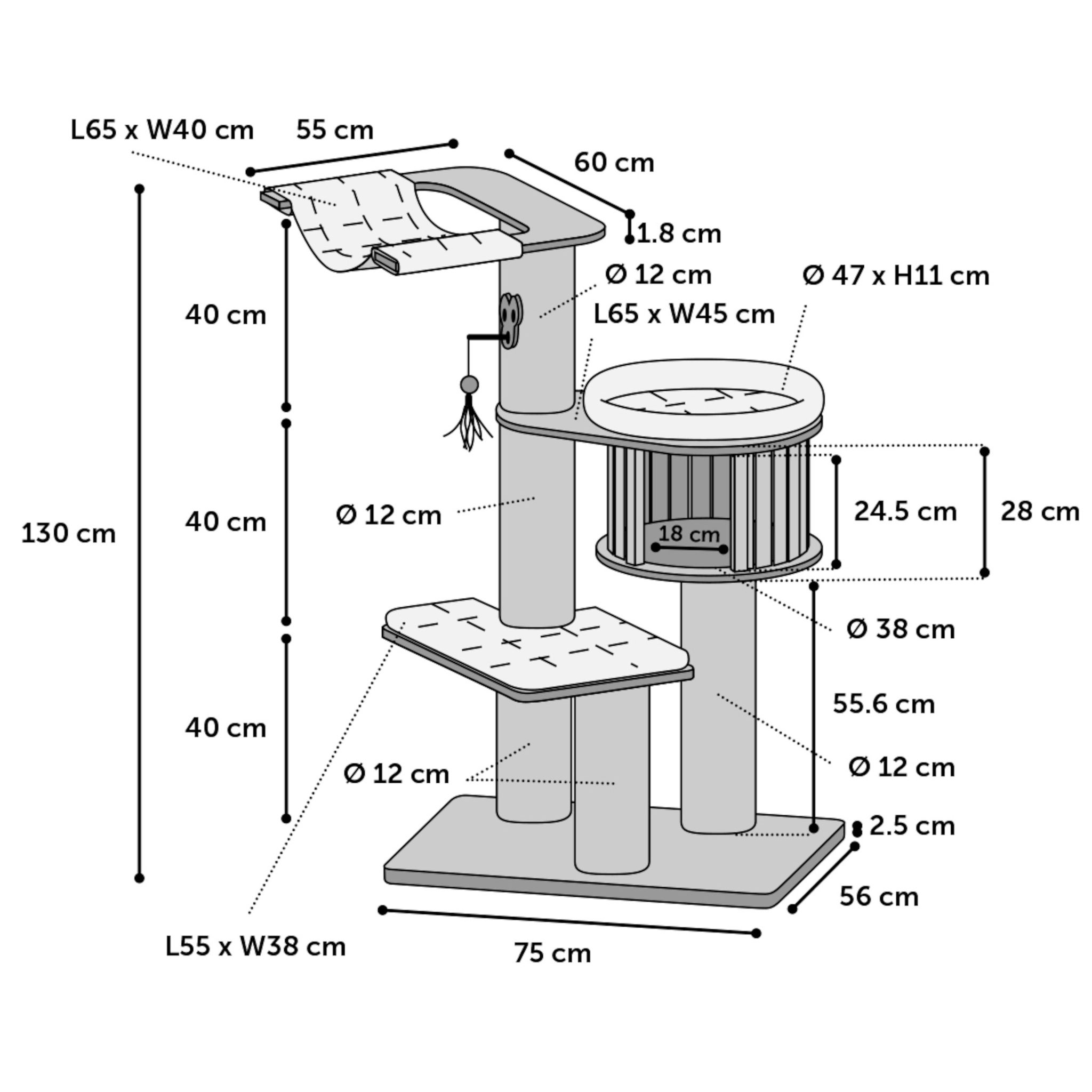 Flamingo Scratching Tree Raisa 2 je ideální volbou pro všechny majitele koček, kteří hledají prostorné a stabilní škrabadlo. Díky své robustní konstrukci a váze 21,6 kg stojí pevně na místě a poskytuje bezpečný prostor i pro více koček nebo větší plemena.
