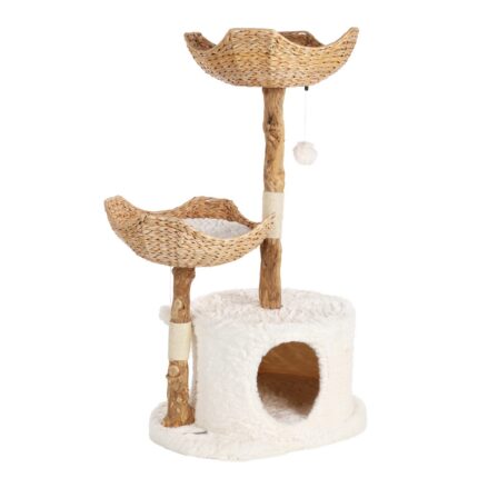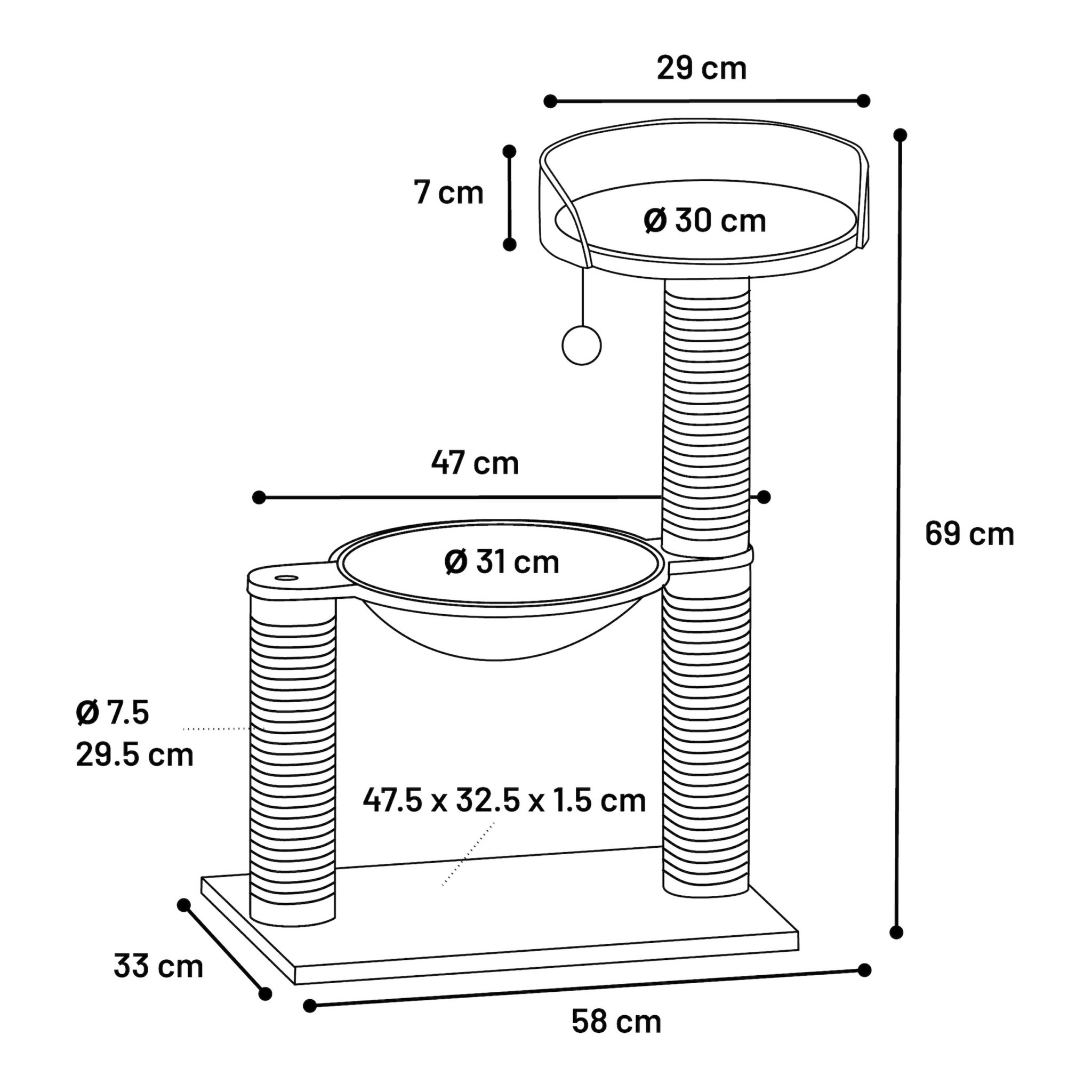 Základní deska o tloušťce 1,5 cm zajišťuje stabilitu, zatímco měkký plyš (250 g/m²) poskytuje dokonalé místo k odpočinku. Součástí je i hamak a polstrovaná plošina, kde může vaše kočka spokojeně odpočívat. Pro ještě větší zábavu je škrabadlo doplněno hračkou s rolničkou, která probudí lovecké instinkty.