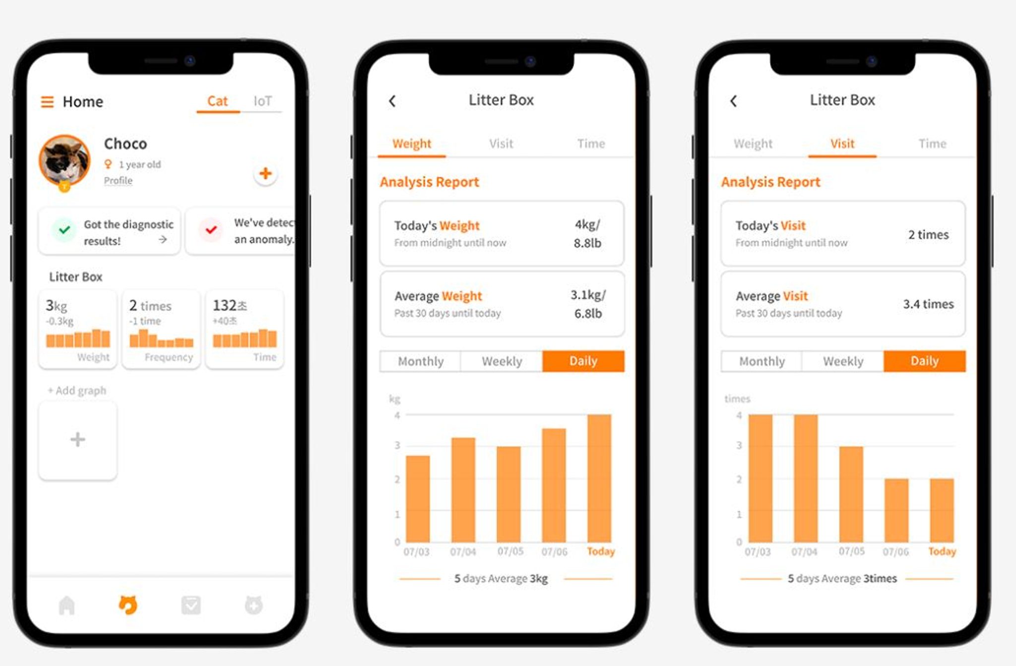 Aplikace je k dispozici zdarma v App Store a Google Play. Aplikace upozorní na aktuální stav odpadu (prázdný, částečně naplněný nebo zcela naplněný), kapacita zásobníku a typ steliva, doba čistění, tlačítko reset, stav připojení k domácí Wi-Fi. Kromě toho si můžete nastavit zprávy o tom, jak často vaše kočka navštěvovala toaletu, připomenutí nutnosti vyprázdnit odpadkový koš nebo když je zásobník steliva prázdný. Pokud máte doma dvě kočky, zařízení je dokáže rozlišit, pokud je rozdíl v jejich hmotnosti alespoň 680 g.