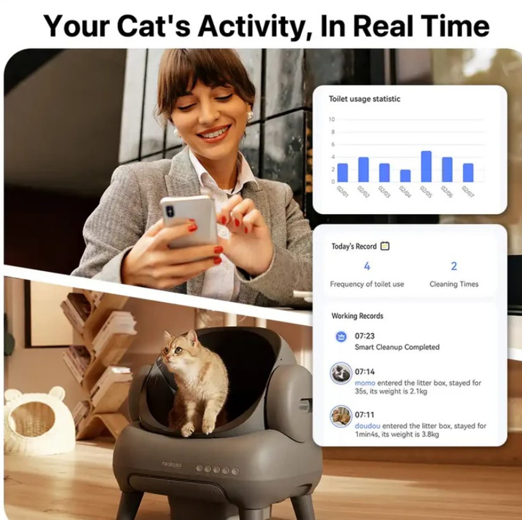 Objevte inteligentní samočisticí kočičí toaletu Neakasa M1 s unikátním otevřeným designem pro maximální čistotu a pohodlí vašich mazlíčků. Toaletu lze jednoduše ovládat přes mobilní aplikaci Neakasa. Díky otevřenému designu a pokročilé technologii prosévání steliva zařízení automaticky odděluje nečistoty od čistého steliva a poskytuje vaší kočičce vždy svěží a pohodlnou toaletu. Záchod je navíc vybaven aplikací Neakasa, která vám umožní sledovat hladinu steliva, množství odpadu a aktivitu vaší kočky a zajistit tak komplexní péči o její zdraví.