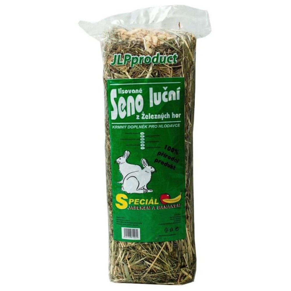 Doplňek stravy ke krmivu. Seno pro hlodavce s banány a jablky.