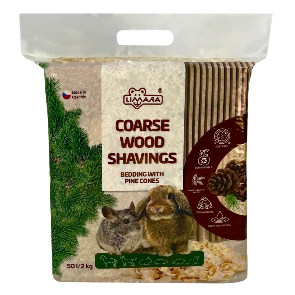 Hrubá hoblinová podestýlka určena pro hlodavce s přidanými šiškami, jakožto herními prvky vhodnými i k okusu.