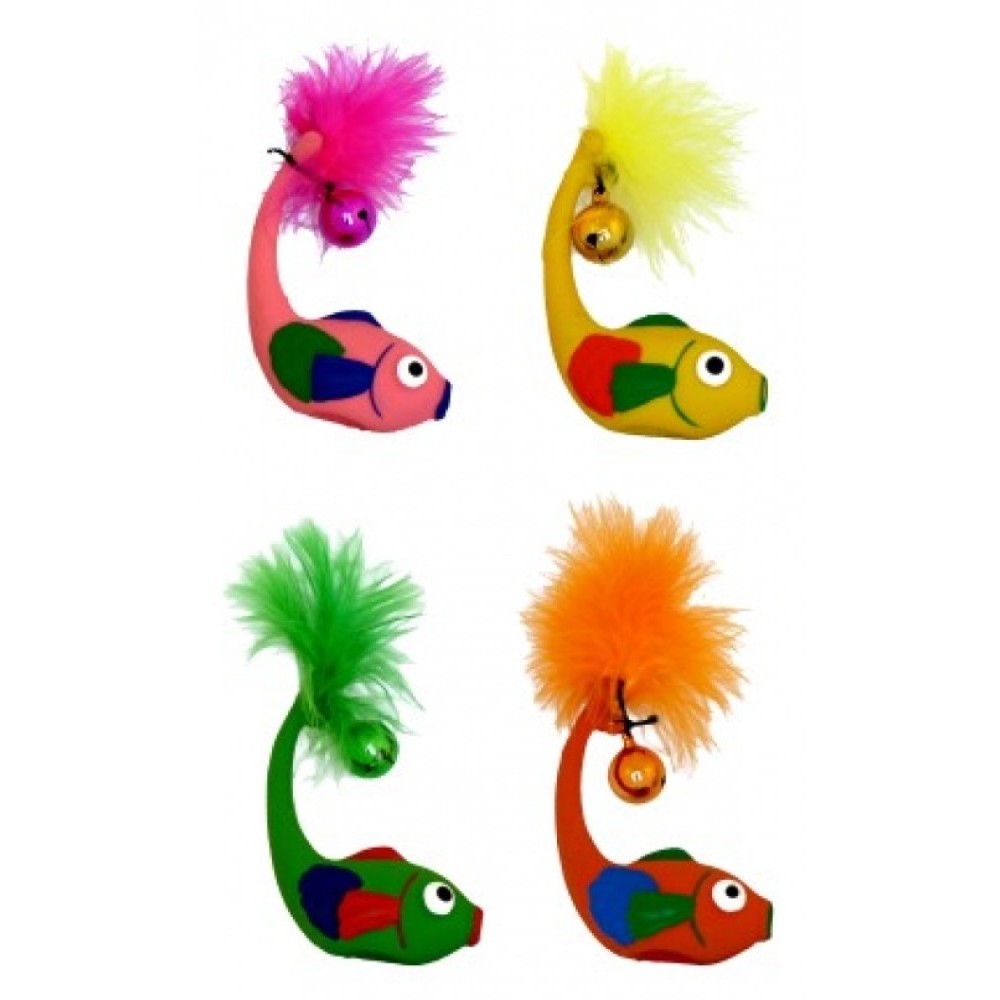 Hračka latex – ryba s rolničkou a peřím 11cm