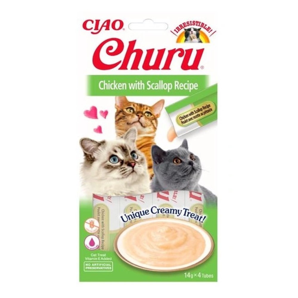 Doplňkové krmivo pro kočky. Masové pyré pro kočky s kuřecím z farmy a hřebenatkou. Lahodný, přírodní pamlsek krémové konzistence bez obilovin.