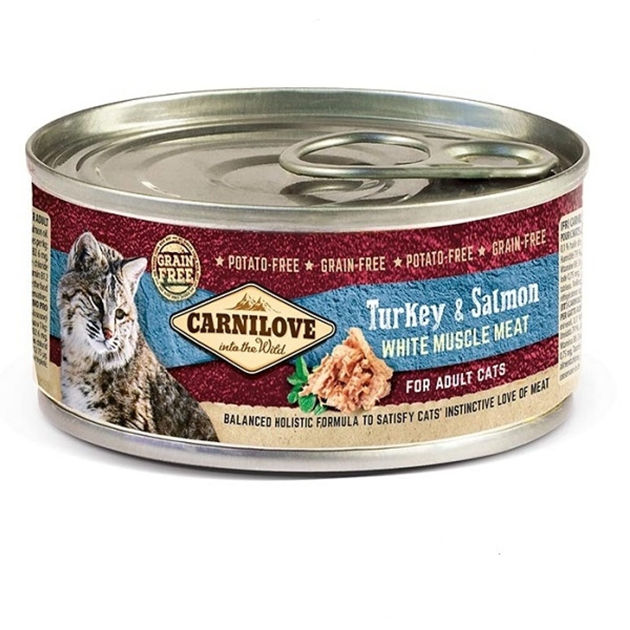 Carnilove konzerva pro dospělé kočky je plná masa z krocana a lososů. Poskytuje kompletní výživu v té nejčistší podobě. Zcela bez obilovin, brambor a sóji. Doplněno brusinkami pro zdravý močový trakt.