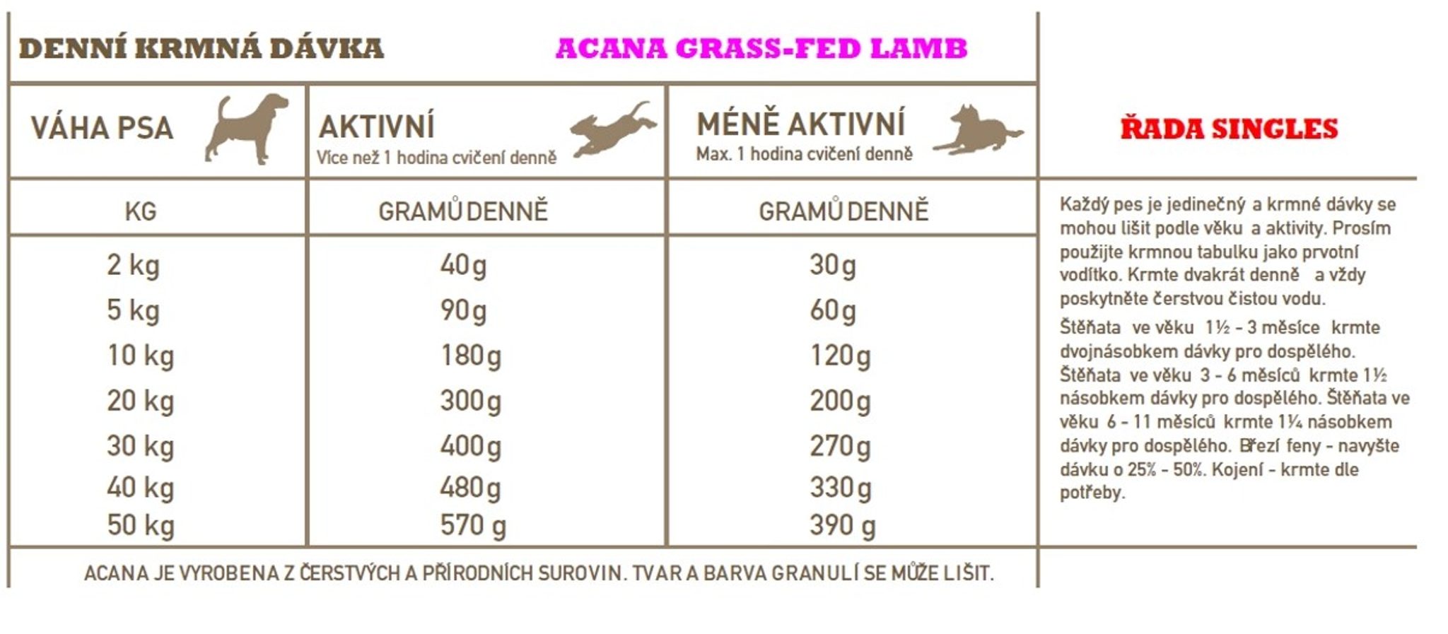 Acana Dog Singles Grass-fed Lamb je krmivo vhodné pro psy všech plemen i věku. Obsahuje maso z novozélandských jehňat. Vhodná i pro pejsky s velmi citlivým zažíváním.