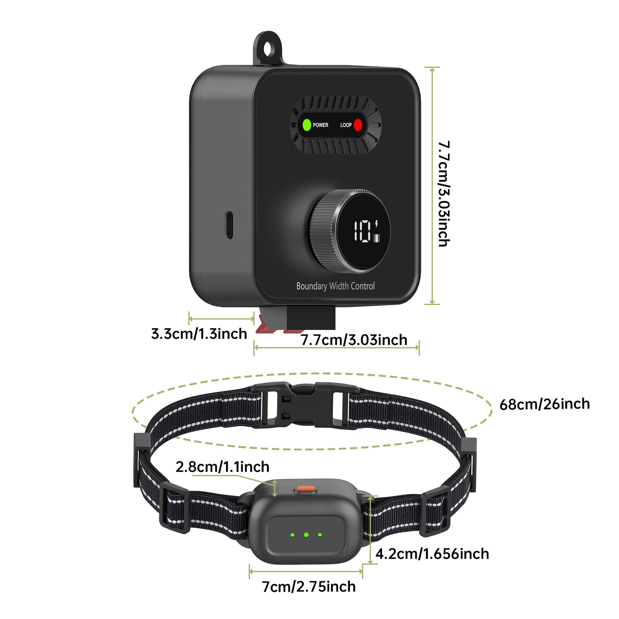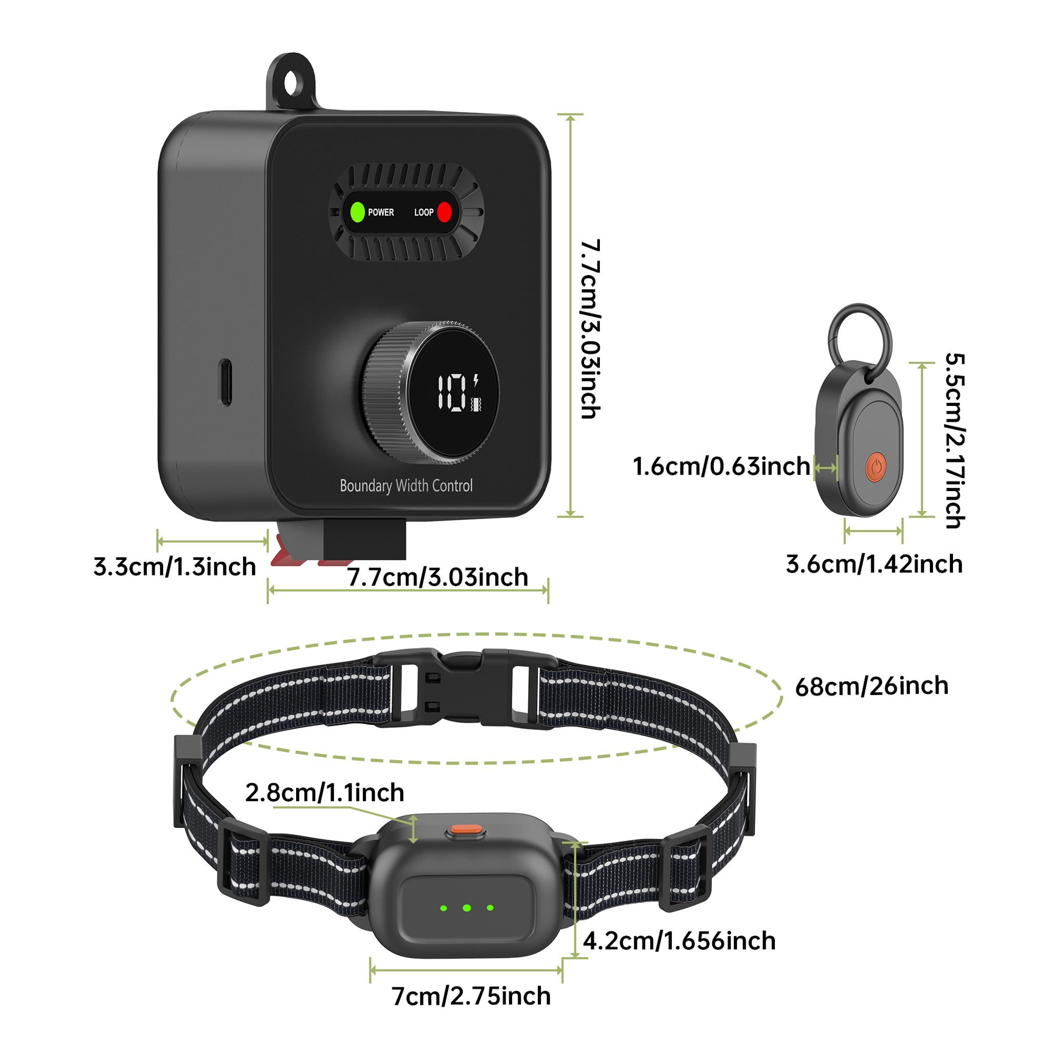 Základna má šířku 7,7 cm, výšku 7,7cm, hloubku 3,3cm. Velký přijímač má šířku 7cm, výšku 4,2cm a hloubku 2,8cm; malý přijímač má šířku 5,5 cm, výšku 3,6 cm a hloubku 1,6 cm. Ohradník je vhodný pro pejsky od 3 kg s obvodem krku od 20 do 55 cm.