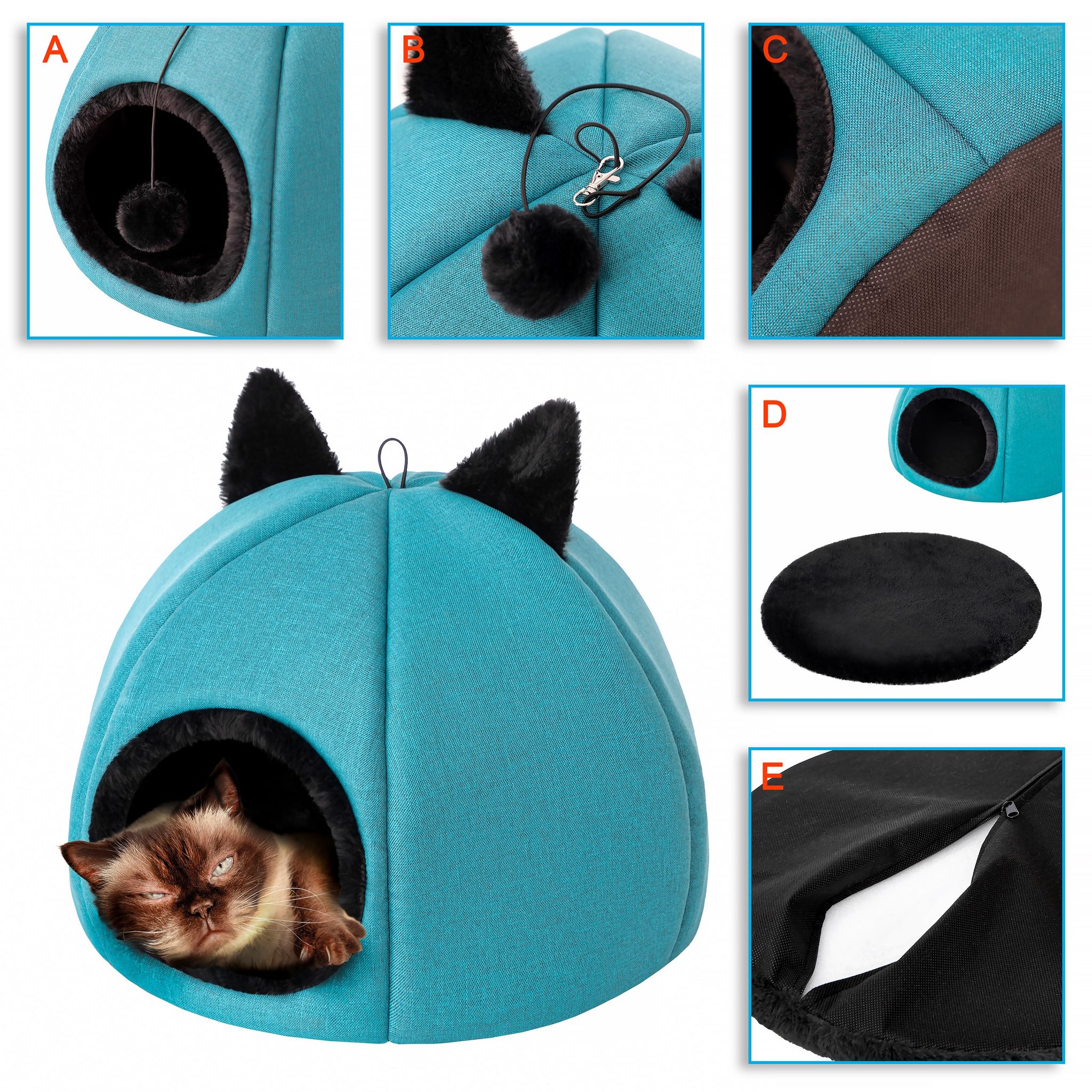 - Zábavná hračka: Na elastickém provázku je připevněna chlupatá kulička, se kterou si kočka může hrát přímo ve svém domečku.