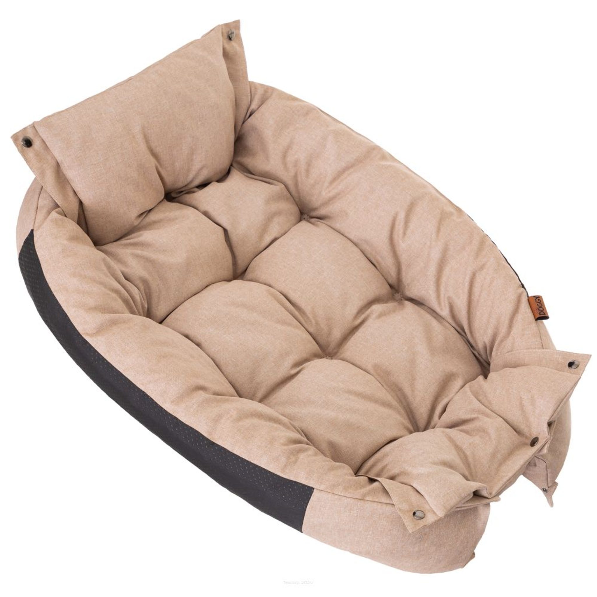Pelíšek je vyroben z voděodolné tkaniny a má protiskluzové dno, takže zůstává stabilní i na kluzkých podlahách. Oboustranný polštář nabízí dva vzhledy v jednom, zatímco měkké, vysoké okraje poskytují oporu a ochranu před průvanem.
