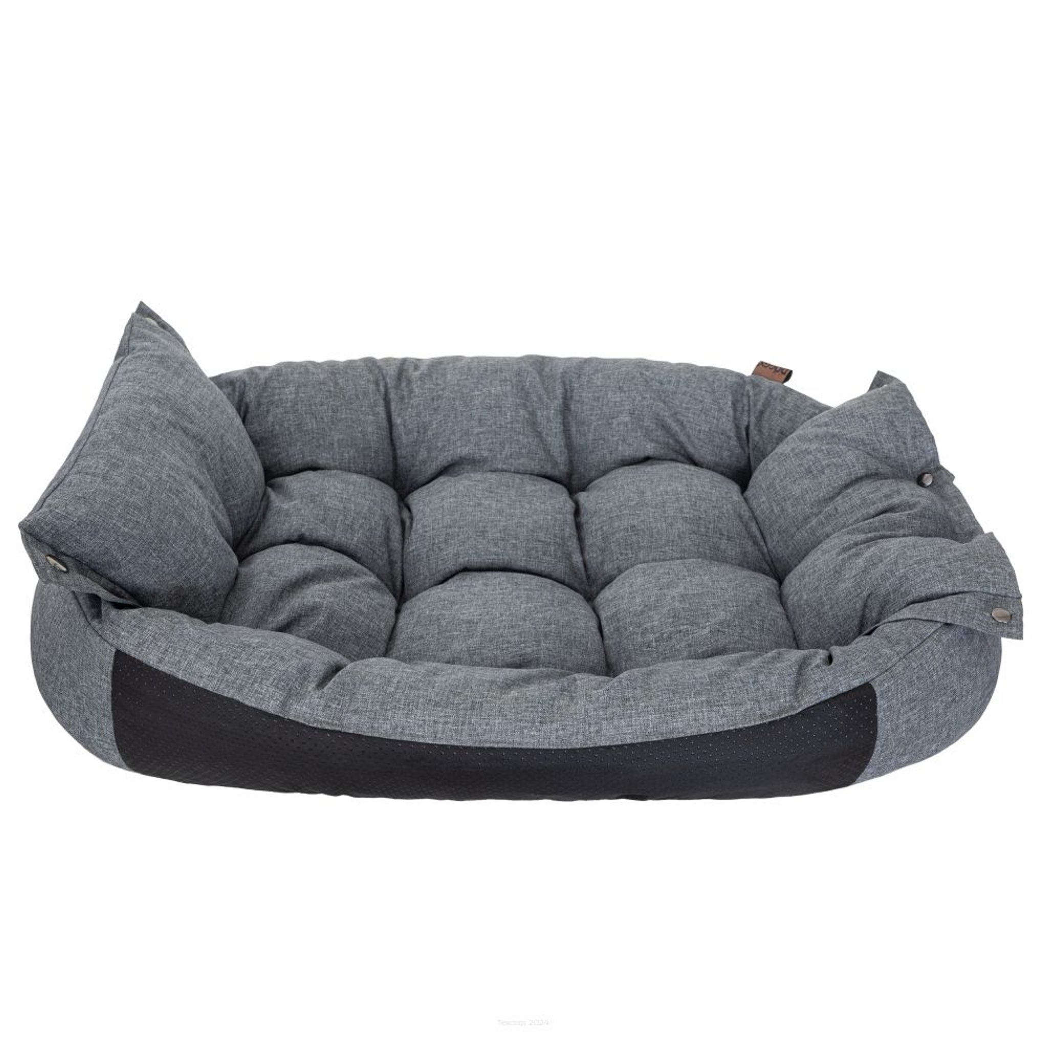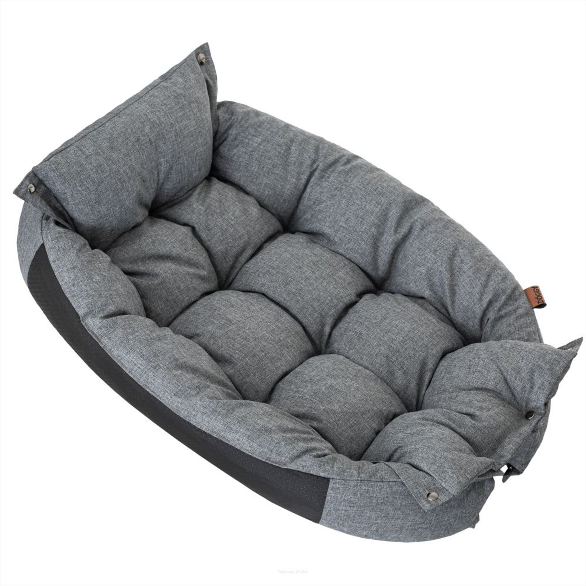 Pelíšek je vyroben z voděodolné tkaniny a má protiskluzové dno, takže zůstává stabilní i na kluzkých podlahách. Oboustranný polštář nabízí dva vzhledy v jednom, zatímco měkké, vysoké okraje poskytují oporu a ochranu před průvanem.