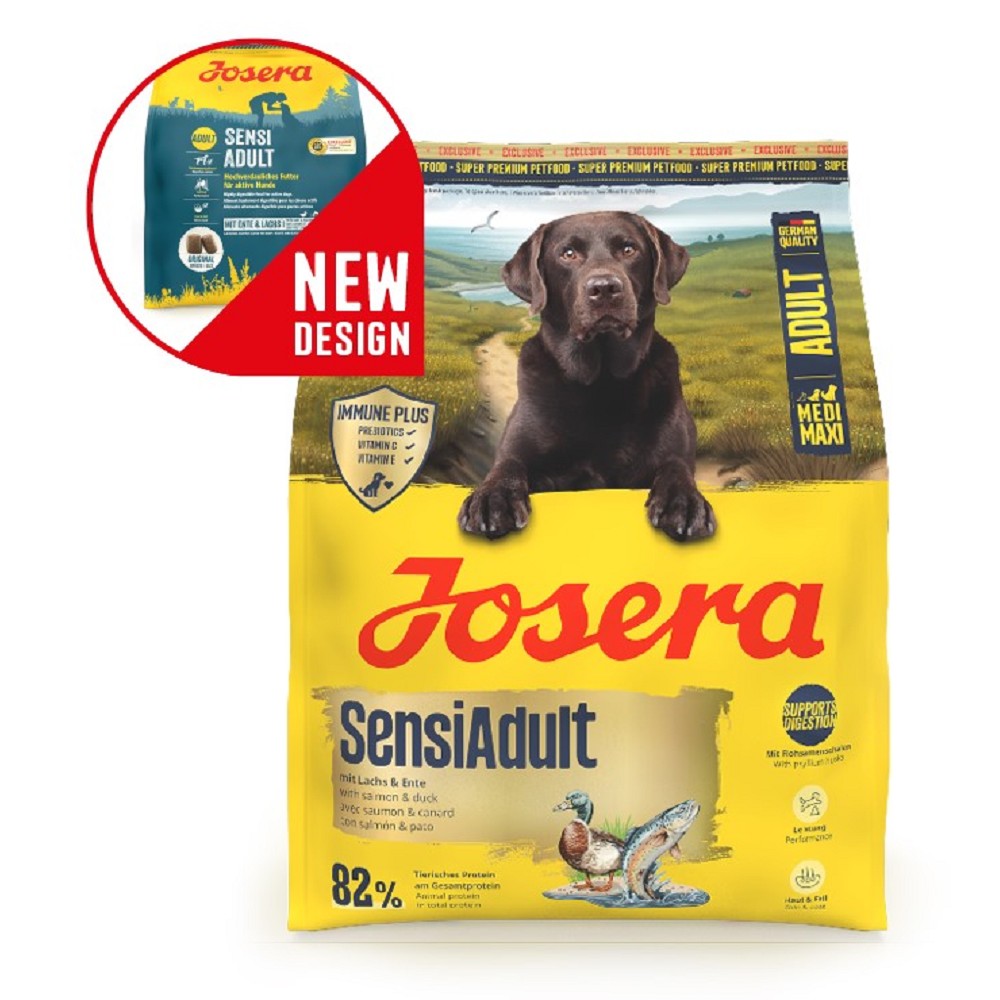 Kompletní krmivo pro psy. Vysoce stravitelná varianta s kachnou a lososem pro dospělé, citlivé psy s vysokou energetickou zátěži.
