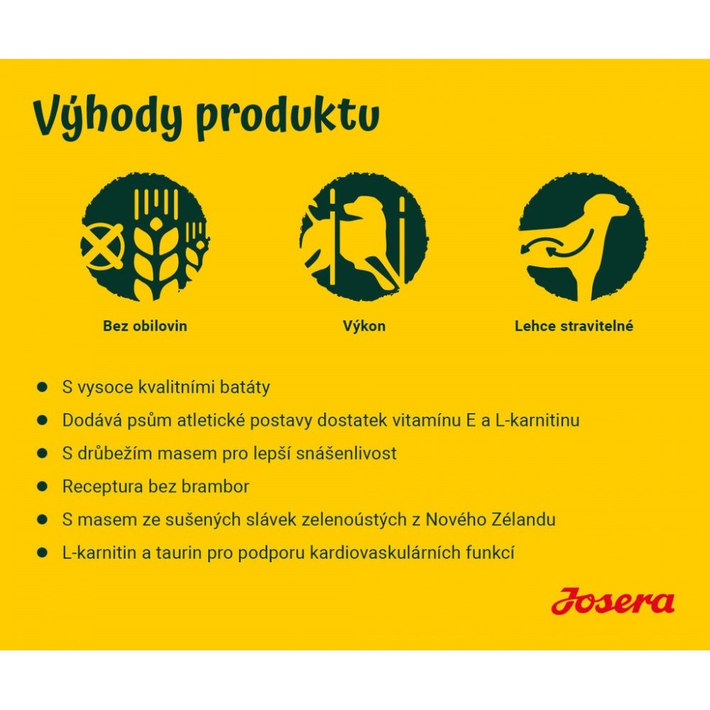 Kompletní krmivo pro psy. Bezobilná varianta bohatá na energii určená speciálně sportovním psům, s lehce stravitelným drůbežím, sladkými brambory, slávkou zelenoústou a L-karnitinem; antioxidanty neutralizují volné radikály.