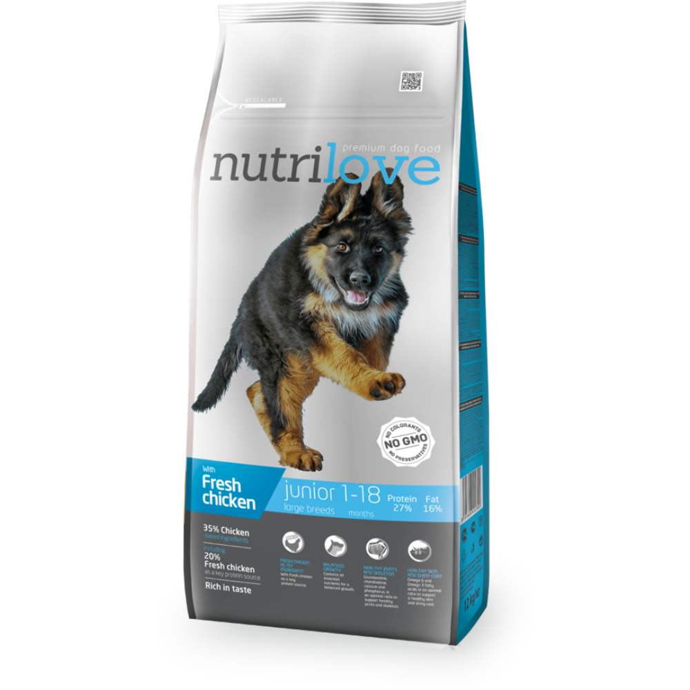 Kompletní krmivo pro štěňata a mladé psy velkých plemen s čerstvým kuřecím a rýží.