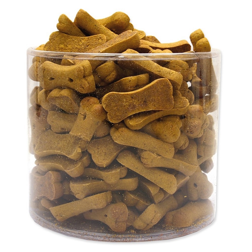 Doplňové krmivo pro psy, sušenky ve tvaru kostiček s drůbeží příchutí.