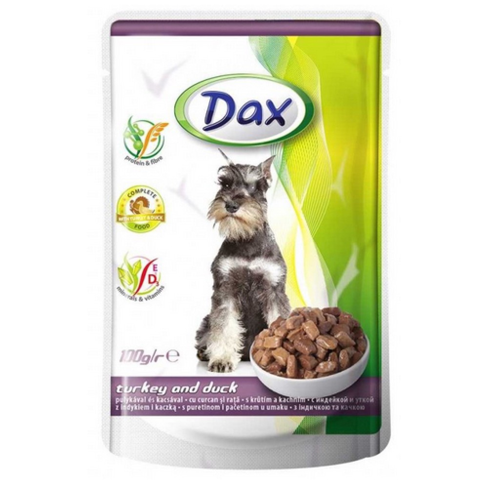 Kompletní mokré krmivo pro psy s krůtím a kachním v omáčce.