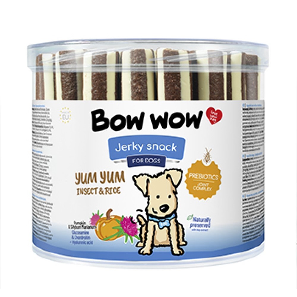 Doplňková strava pro psy, trubičky s hmyzím proteinem a rýží.
