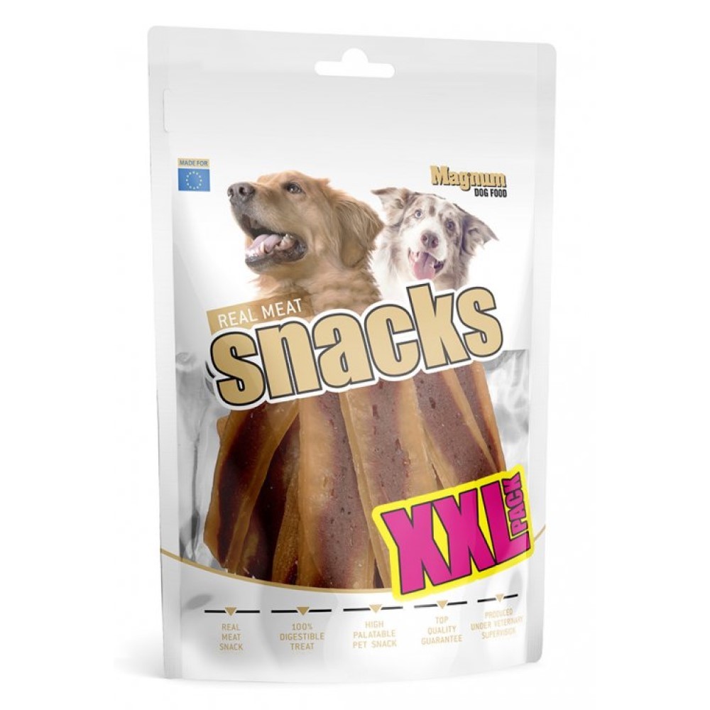 Doplňkové krmivo pro psy. Měkká, přírodní masová pochoutka z kuřecího a hovězího masa, ve tvaru filetu, které se snadno dělí na menší kousky.