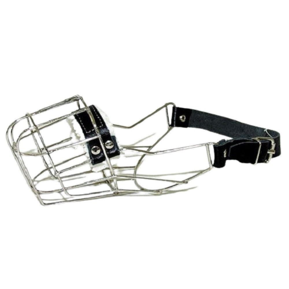 Kovový náhubek s koženými řemínky na zapínání pro fenu amerického staf. teriéra.