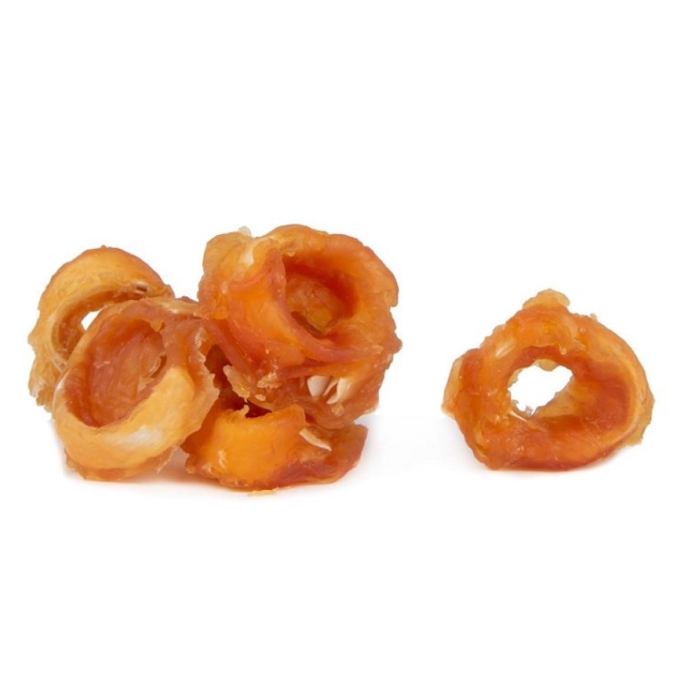 Měkká, přírodní masová pochoutka pro psy. Kuřecí a rybí maso formované do středně velkých kroužků.