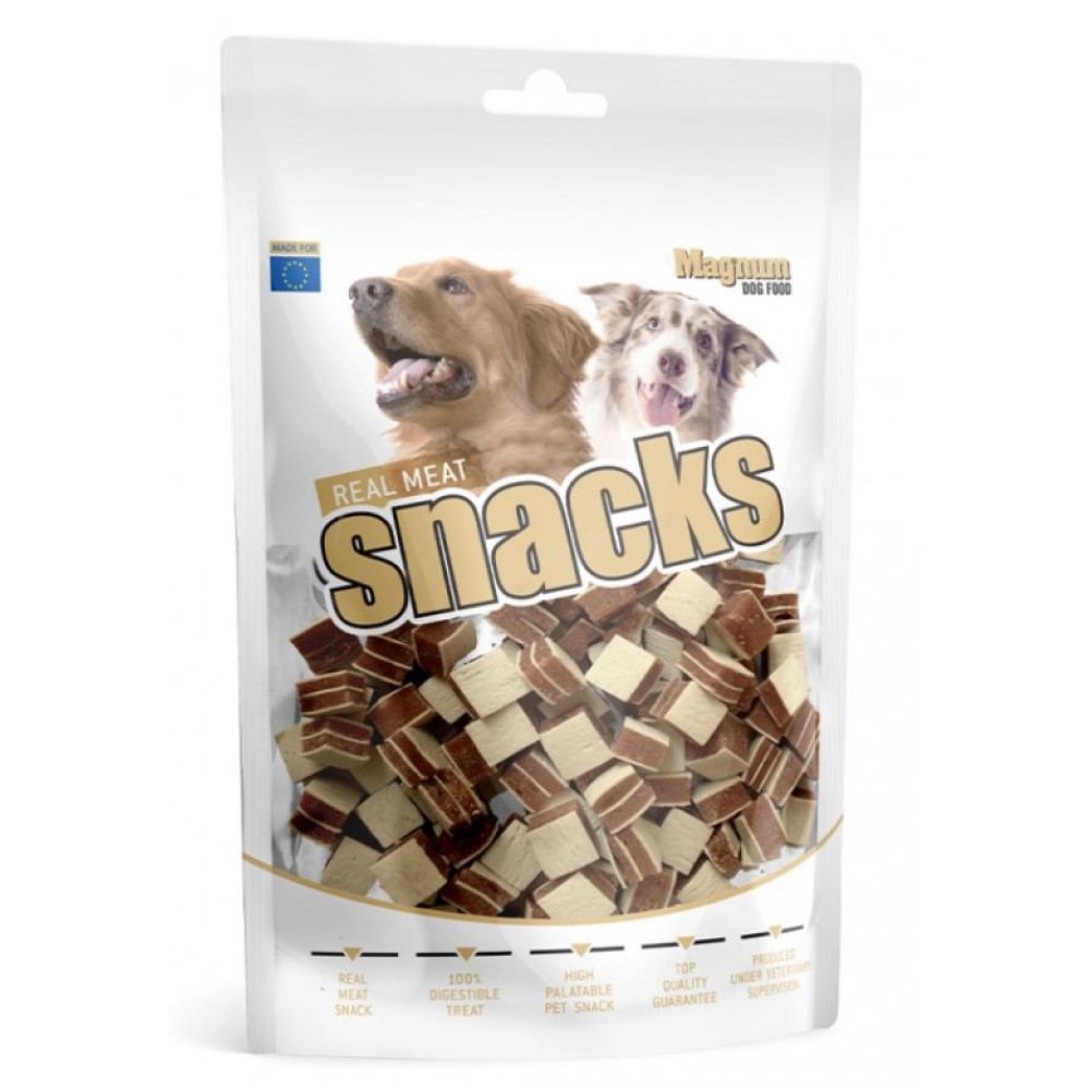 Doplněk stravy. Měkká, přírodní masová pochoutka z kuřecího a rybího masa – kousky.