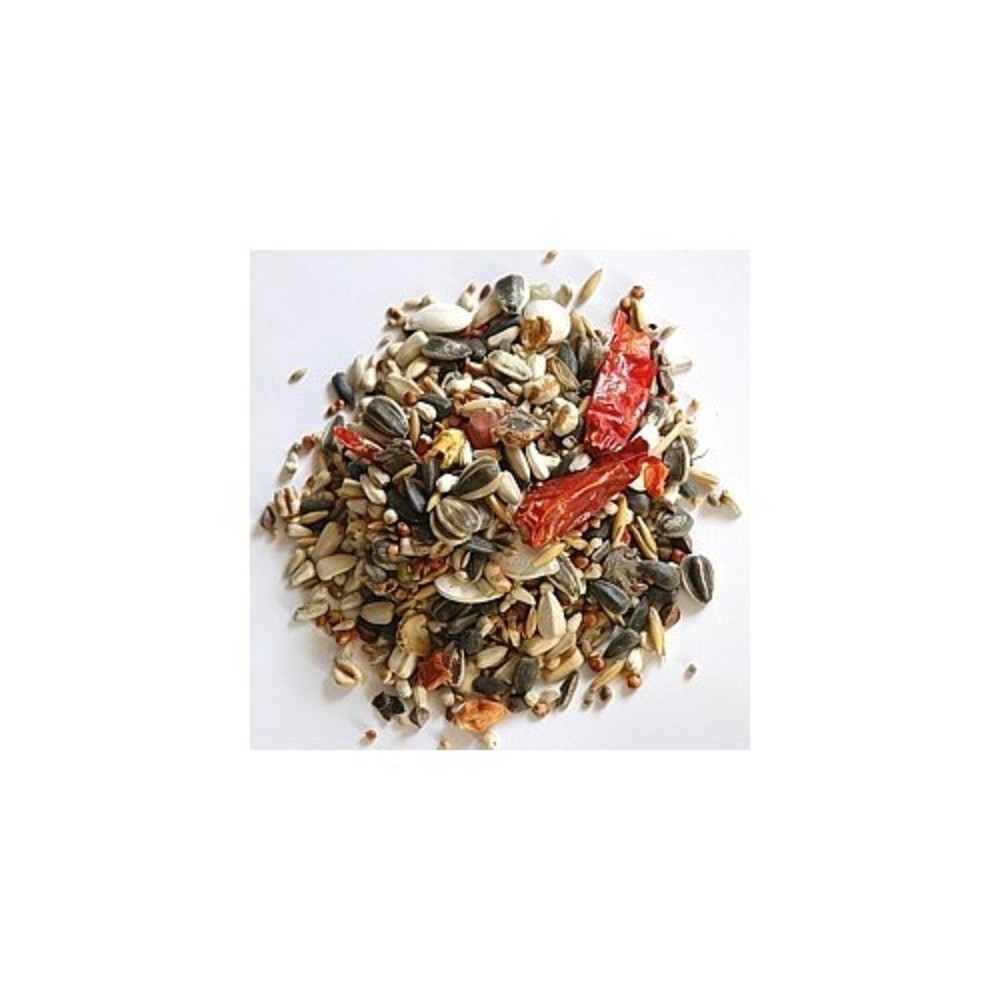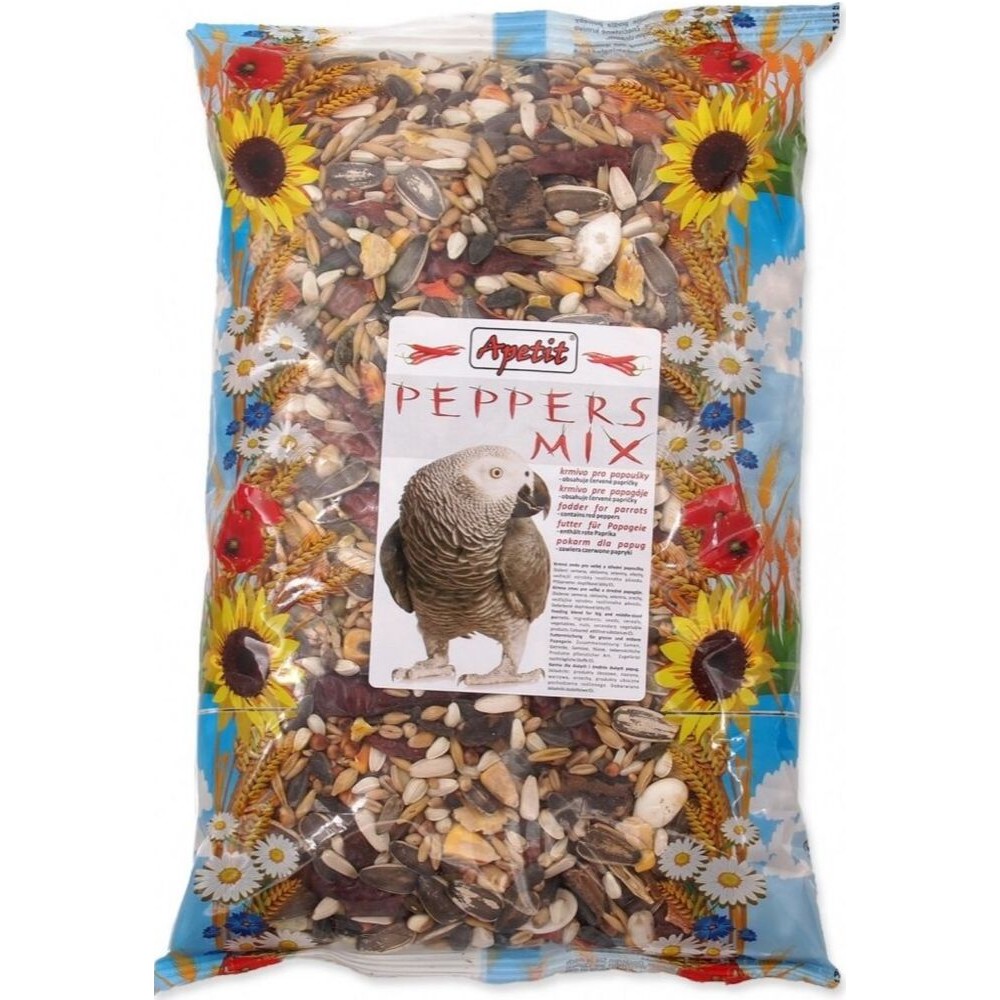 Krmná směs pro papoušky. Obsahuje červené papričky.