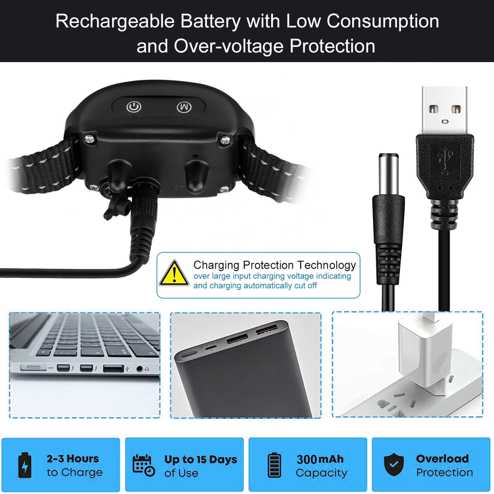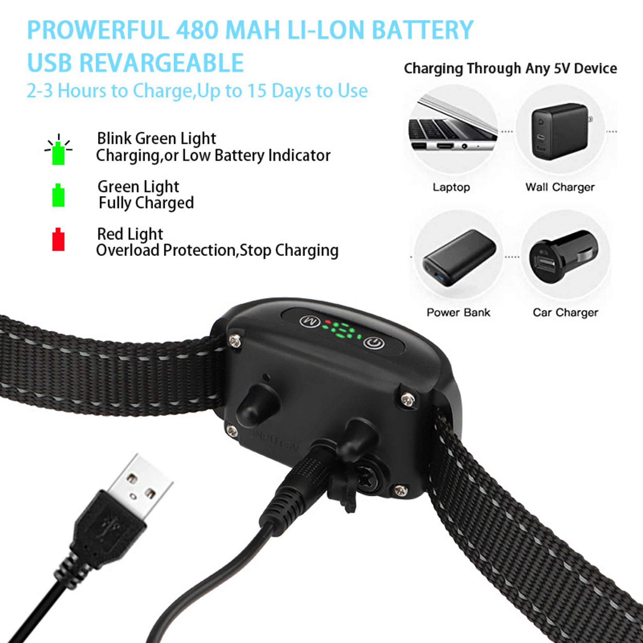 Obojek proti štěkání Reedog V2 s vysokokapacitní baterií, lze plně nabít pomocí USB přiloženého USB kabelu za 2-3 hodiny až na 10-15 dní pracovní doby. Především záleží na tom jak často se obojek spouští.