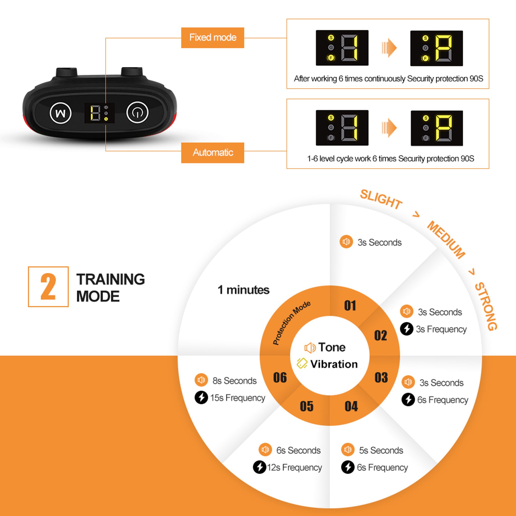 Obojek nabízí dva tréninkové režimy, automatický a fixní. Režim automatického nastavení pomáhá psovi postupně napravovat špatné návyky. Fixní režim je možné nastavit od úrovně 3 až 6.