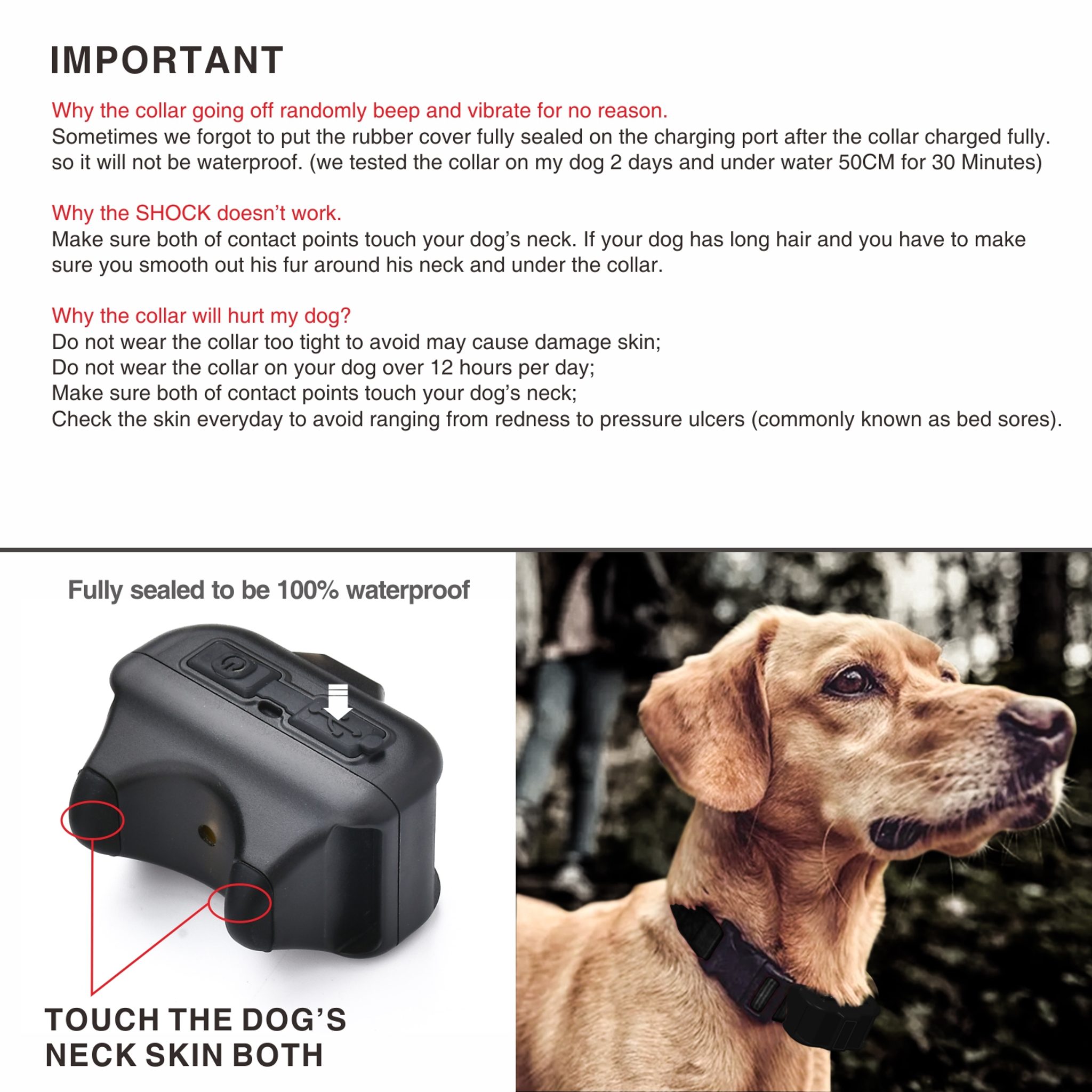 Výcvikový obojek psů Patpet DB60 je pouze voděodolný s označením ochrany IPX5. Lze jej používat pouze ve slabém dešti, dlouhodobější pobyt ve vodě a potápění ovšem není možné. Obojek je tak ideální volbou spíše pro základní použití, nikoli ale pro výcvik psů ve vodě.