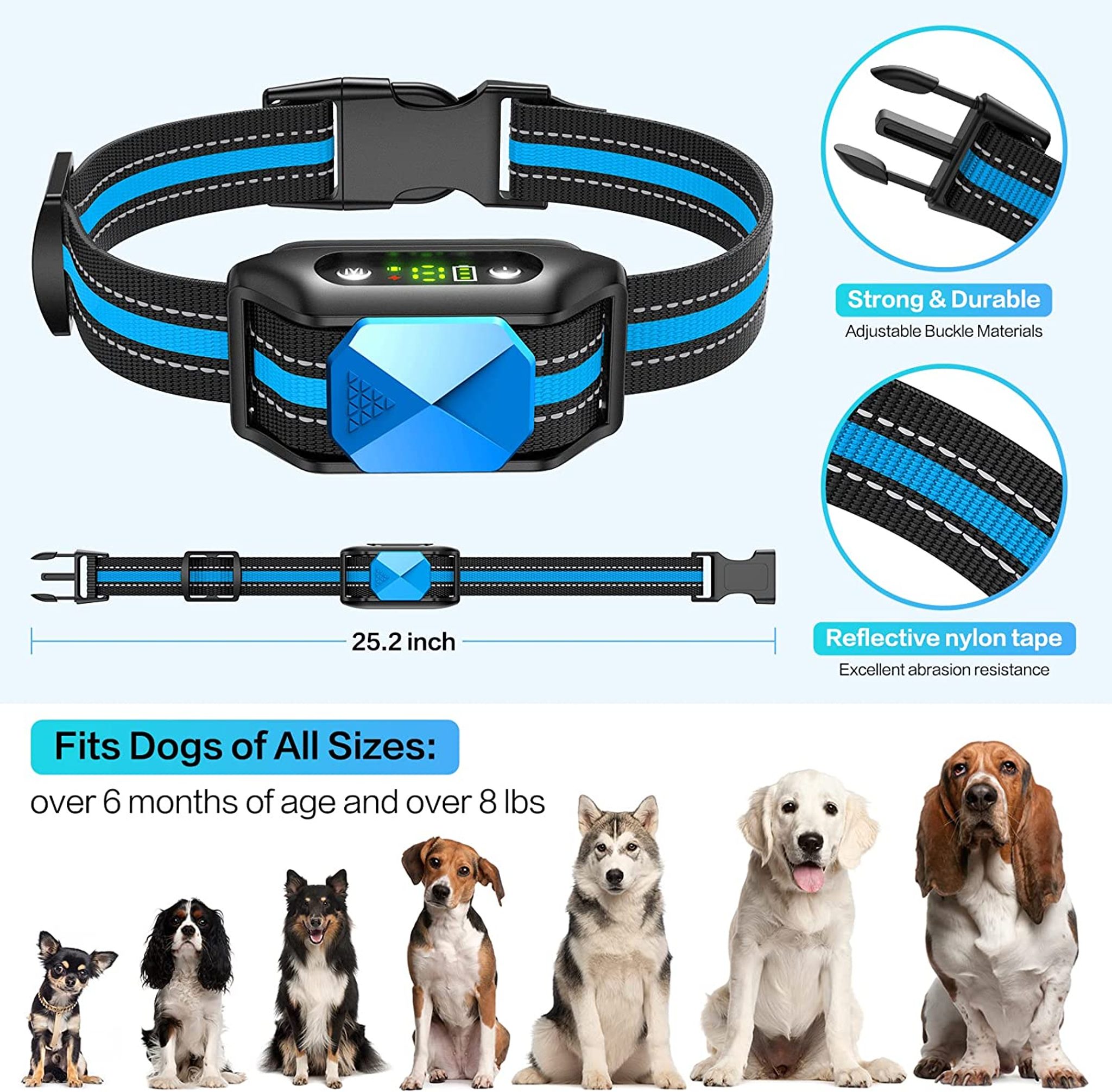 Obojek proti štěkání disponuje rozměry: 3,5 cm x 6 cm x 3 cm (šířka, výška, hloubka) a ergonomickým tvarem. Pejskům tak velmi usnadní nošení a snáze si na něj zvyknou. Obojek váží pouhých 52 g.